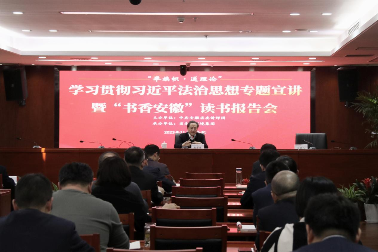 11月23日下午,省委講師團(tuán)“舉旗幟·送理論”學(xué)習(xí)貫徹習(xí)近平法治思想專題宣講暨“書香安徽”讀書報(bào)告會(huì)走進(jìn)省生態(tài)環(huán)境集團(tuán)。報(bào)告會(huì)邀請(qǐng)省人民檢察院黨組成員、副檢察長(zhǎng)、一級(jí)高級(jí)檢察官陶芳德作專題宣講報(bào)告。集團(tuán)公司黨委及經(jīng)營(yíng)班子成員,各直屬(控股)公司主要負(fù)責(zé)人、法務(wù)合規(guī)工作分管領(lǐng)導(dǎo)及部門負(fù)責(zé)人,集團(tuán)本部中層及以上管理人員參加報(bào)告會(huì)。