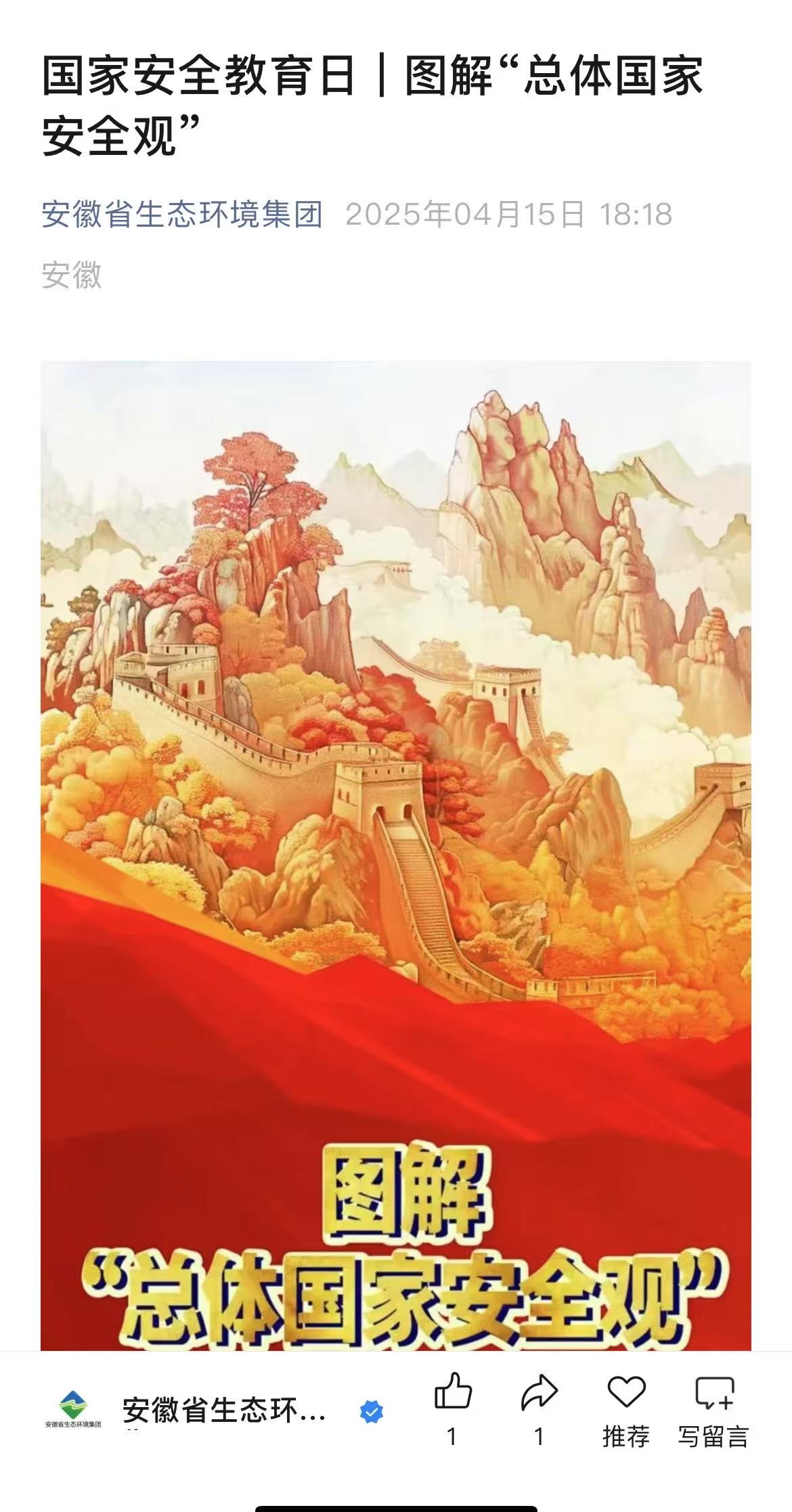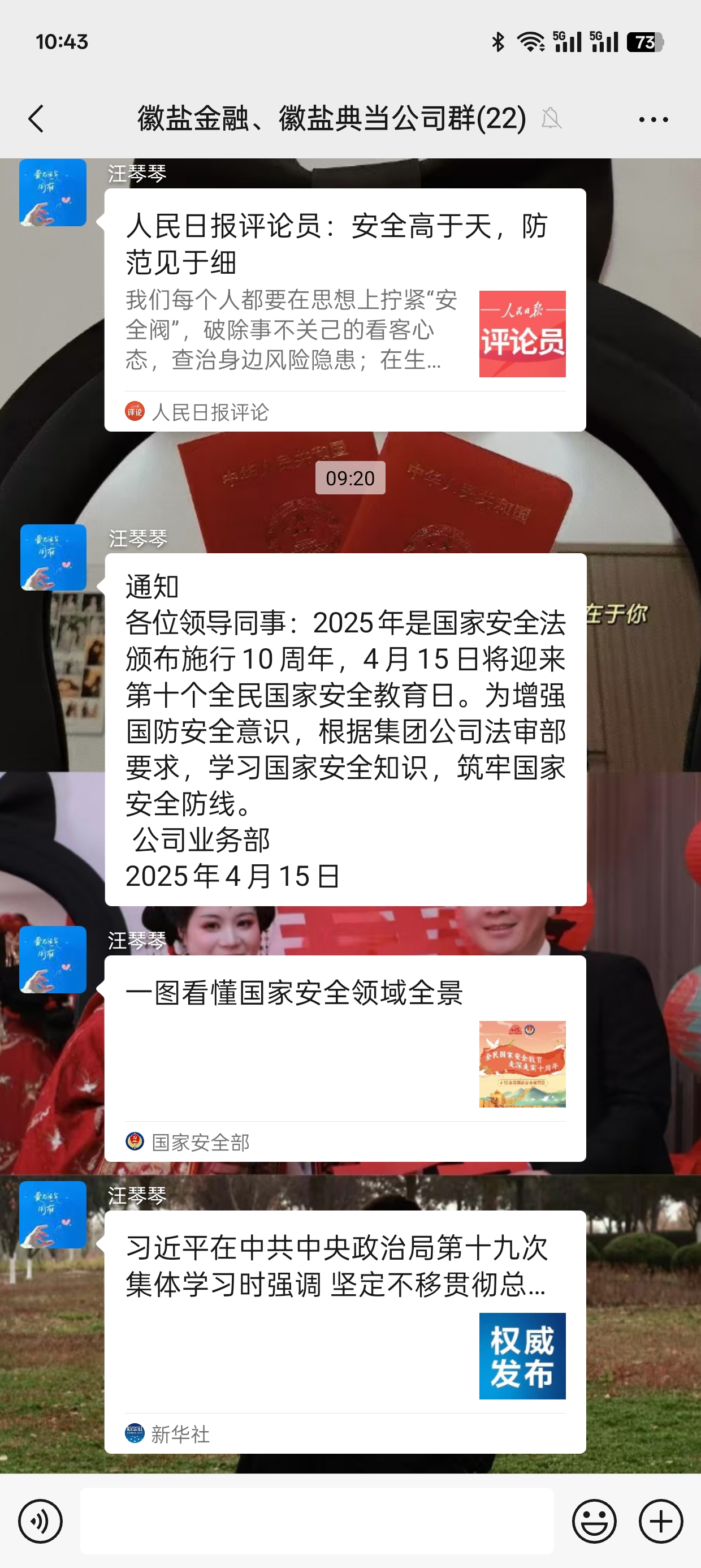 地產(chǎn)集團(tuán)微信群每日推送國(guó)家安全知識(shí)圖解、微視頻,以“碎片化學(xué)習(xí)”提升普法滲透力;集團(tuán)公司、環(huán)境科技集團(tuán)微信公眾號(hào)發(fā)布專題推文《國(guó)家安全,你我同行》,通過(guò)案例剖析、法條鏈接等形式,生動(dòng)解讀《國(guó)家安全法》《反間諜法》;徽鹽金融等子公司組織線上答題活動(dòng),覆蓋全員,以考促學(xué)鞏固國(guó)家安全基礎(chǔ)知識(shí),參與率達(dá)100%。